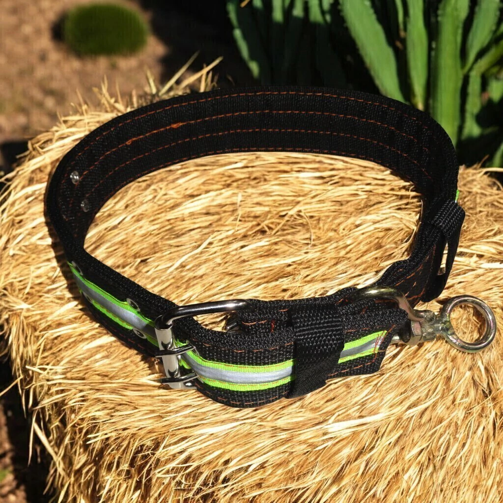 Descripción: Asegura la comodidad y seguridad de tu perro grande con el Collar Doble XL 5.0. Fabricado en cinta Nato doble con costura reforzad, detalle de cinta fluo y refractaria, garantizando visibilidad durante los paseos. Su doble hilera de ojales proporciona un ajuste óptimo, mientras que el mosquetón de bronce reforzado asegura una sujeción firme y duradera.