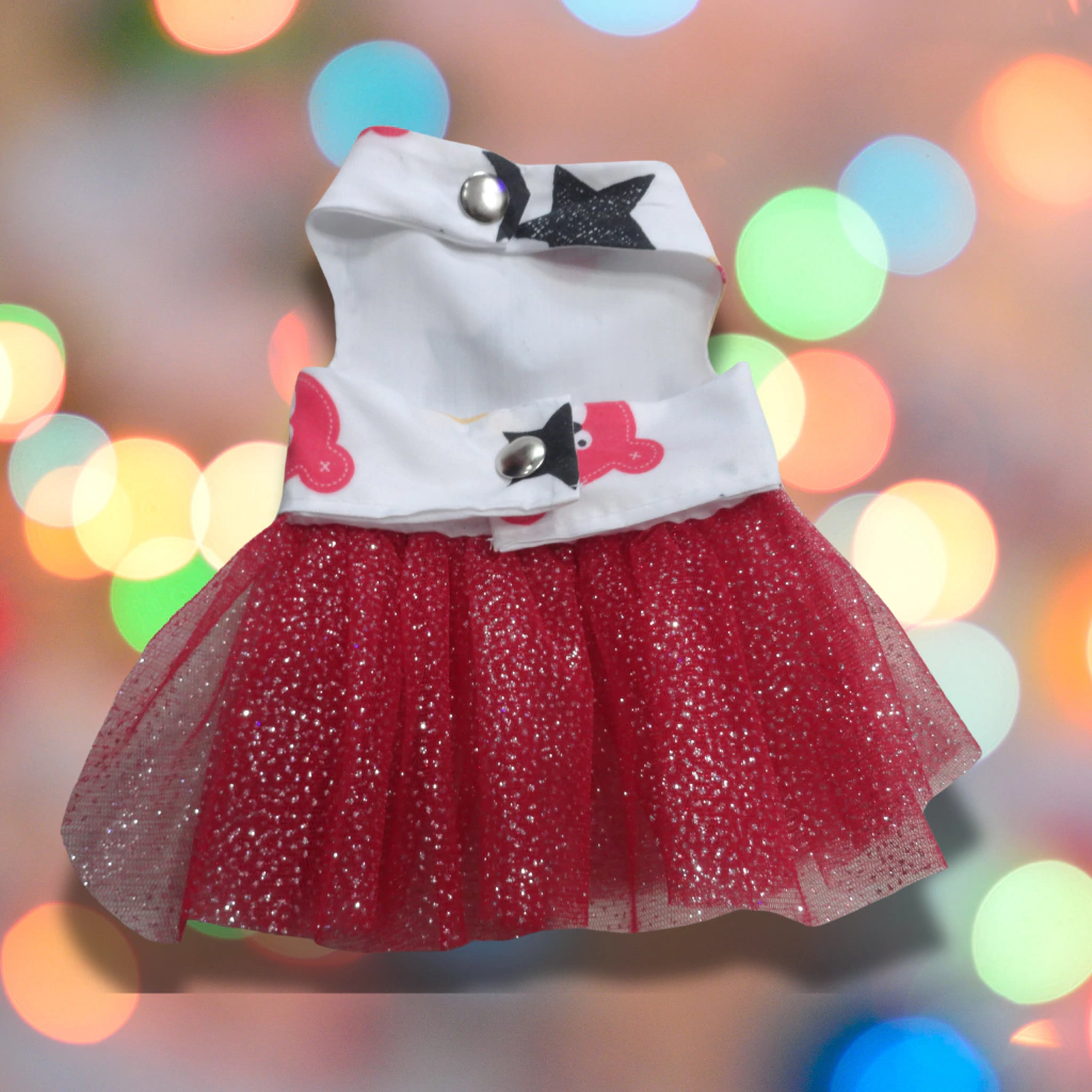 Celebre la magia de la temporada navideña con nuestro Vestidito "Destellos Navideños". Este encantador atuendo está diseñado para que su mascota brille en cada ocasión especial, combinando tela estampada y tul con glitter para un efecto deslumbrante.